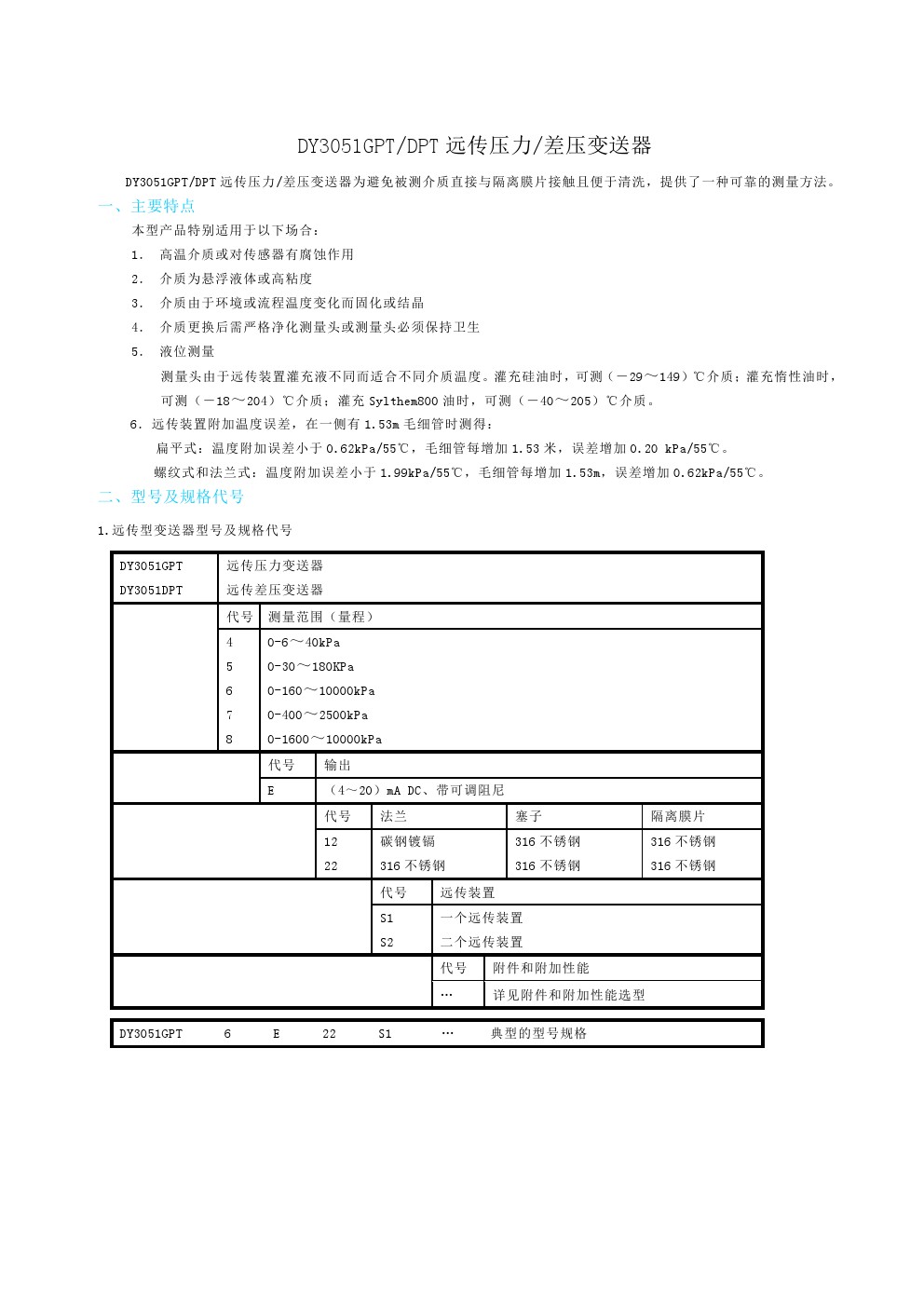 DY3051GPT或DPT遠(yuǎn)傳壓力差壓變送器